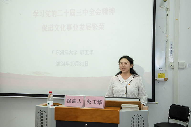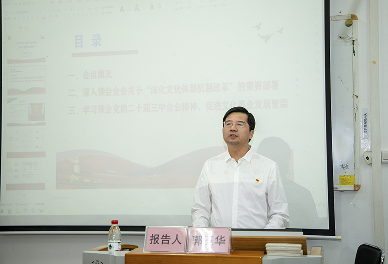 之后,郭玉华博士以“学习党的二十届三中全会精神,促进文化事业发展繁荣”为主题为大家做宣讲报告。她围绕党的二十届三中全会概况、深入领会全会关于“深化文化体制机制改革”的重要部署、学习领会党的二十届三中全会精神,促进文化事业发展繁荣三个方面对党的二十届三中全会精神进行了全面讲解,并结合公司新时代高质量发展行动方案和艺术公司实际情况,提出了具体的学习贯彻措施。宣讲报告内容丰富、深入浅出,对于大家进一步统一思想、明确方向、坚定信心、推动工作具有重要的指导意义。