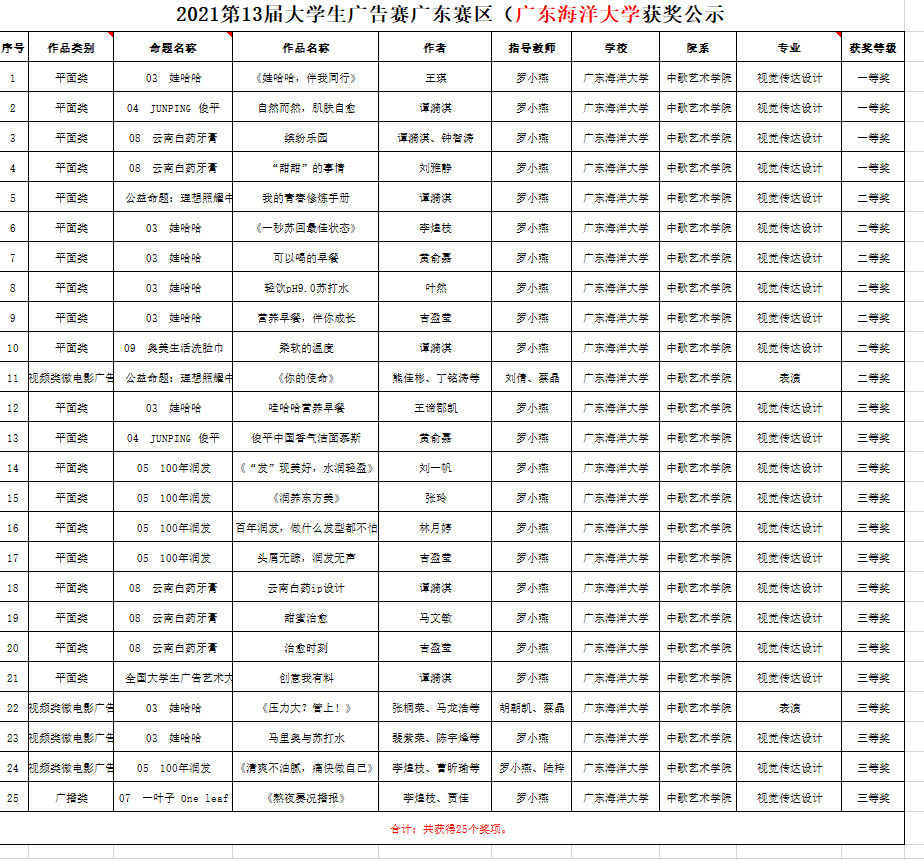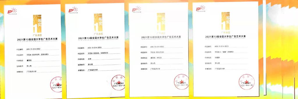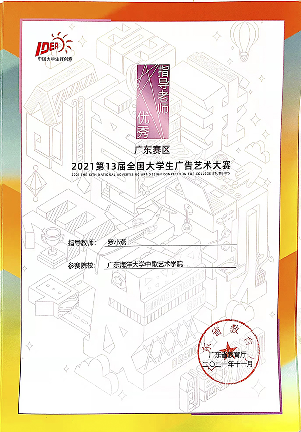 近日,公司beet365学子在由教育部高等教育司指导,中国高等教育学会、教育部高等公司新闻传播学类专业教学指导委员会共同主办的第十三届全国老员工广告艺术大赛(广东赛区)上取得优异成绩,斩获大赛25个奖项。其中一等奖4项,二等奖7项,三等奖14项,罗小燕老师获广东省教育厅颁发的“优秀指导教师”奖。
