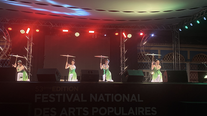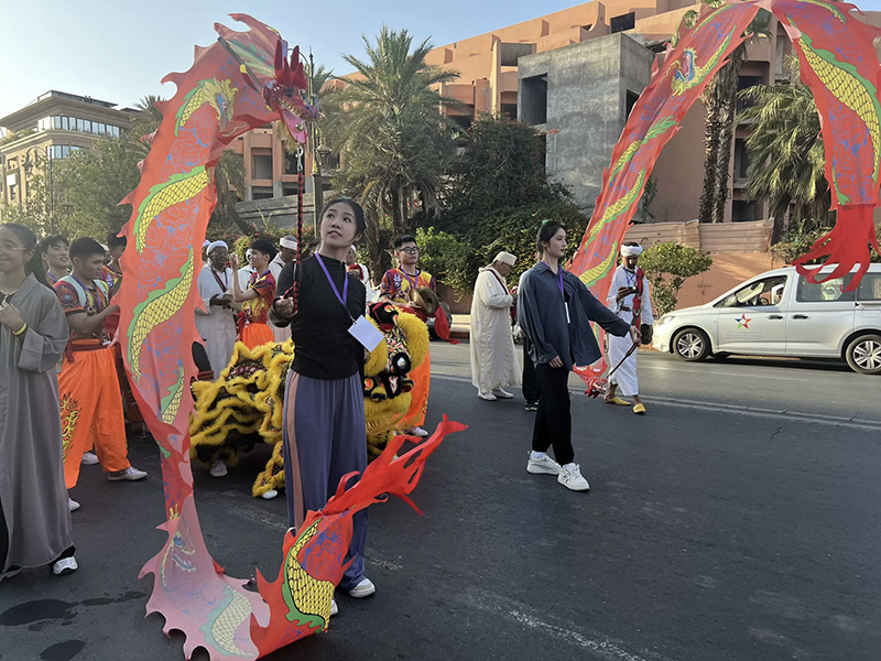 第53届摩洛哥全国民间艺术节在摩洛哥红色之城马拉喀什市举行,中国高校代表团与摩洛哥表演团队联合进行三场演出和一场巡游,演出规模盛大,共计65支表演团队参与了演出和巡游。影响力度大,宣传范围覆盖该市主干道路及繁华地段,受到了摩媒体、CGTN、摩国家广播电视台、摩通社、2M等媒体的广泛关注及报道。