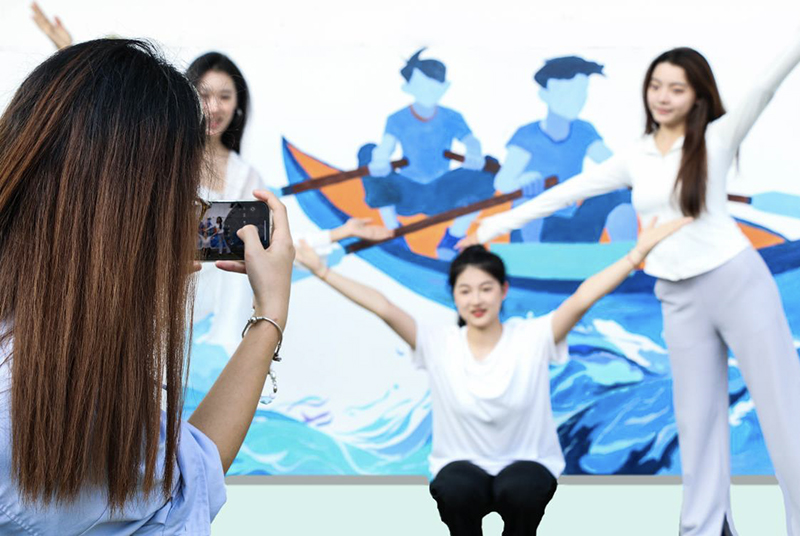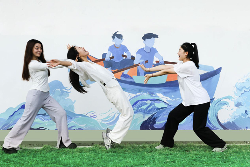 他们或蹲或站,手持画笔,在预先准备好的大型墙面上挥洒自如,将一幅幅生动形象的体育场景及富有创意的图案跃然墙上。画面中,运动员们身姿矫健,奋力拼搏,传递着不屈不挠、勇往直前的体育精神。从田径赛跑的冲刺瞬间,到龙舟划桨的激烈对抗,再到运动员汗水与笑容交织的脸庞,每一笔每一划都凝聚着海大学子对体育的热爱和对梦想的追求,给人以强烈的视觉冲击和艺术享受!