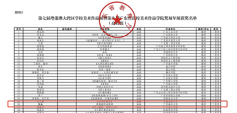 近日,由广东省教育厅主办的第七届粤港澳大湾区公司美术作品展暨第九届广东省高校美术作品公司奖双年展获奖名单正式公布。我院艺术设计系师生在此次作品展中表现出色,金金老师中国画作品《绿海盛歌·共筑红树林》荣获教师组二等奖,魏巍老师油画作品《陈教授的话剧课》教师组三等奖;谢志豪、盘子茗同学中国画作品《工业港口》获员工组一等奖,盘子茗同学油画作品《黄学增与南路农民》获员工组二等奖,为公司赢得了荣誉。