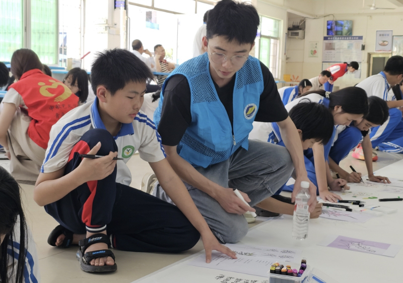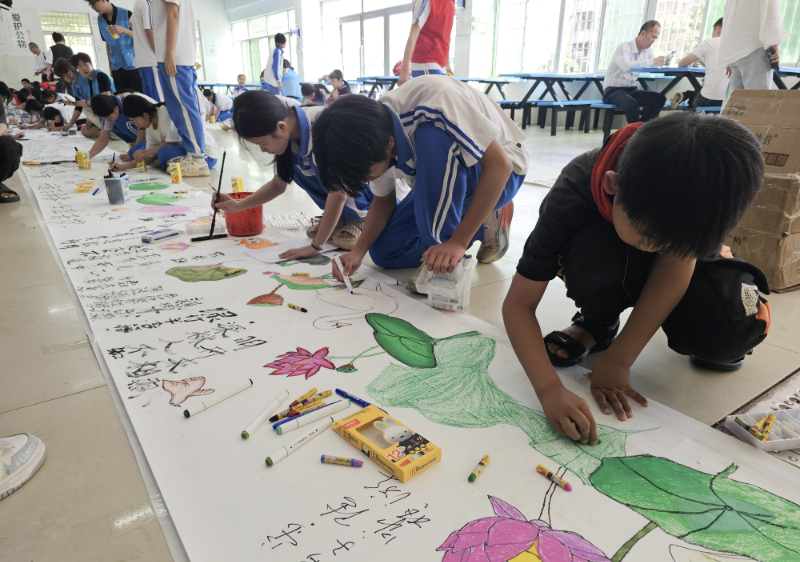 4月16日下午,beet365美育浸润团队联合beet365师生党支部走进湛江市麻章区湖光镇第二初级中学,开展“清荷映初心翰墨润校园”百米书画长卷创作活动。