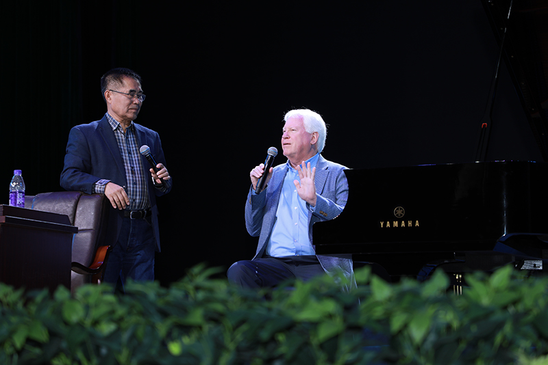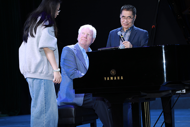专场钢琴音乐会为现场观众带来了耳目一新的音乐感受。音乐会在巴赫《降B大调组曲》中拉开帷幕。约翰·塞尔文以精湛的技巧勾勒出巴洛克音乐的复调之美,指尖下的音符层次分明、灵动悠扬,仿佛将听众带回18世纪的音乐殿堂,让大家直观感受到古典音乐的严谨与优雅。紧接着,贝多芬《G大调奏鸣曲》奏响,激昂的旋律与细腻的情感交织,他通过强弱对比和节奏变化,将作品中蕴含的生命力量与抗争精神展现得淋漓尽致,观看演出的观众给与热烈的掌声。两首古典音乐之后,著名爵士乐作曲家戴夫·布鲁贝克的爵士经典作品《回眸》让现场氛围变得轻松灵动,约翰·塞尔文运用即兴的演奏手法,将爵士音乐的自由洒脱与韵律感完美呈现,指尖在琴键上跳跃游走,多变的节奏型让师生们忍不住跟着节拍轻晃身体。音乐会的后半部,中国经典曲目《浏阳河》的演绎更是将音乐会推向高潮,他巧妙地将西方演奏技巧与中国民族音乐元素相结合,熟悉的旋律在琴键间流淌,既保留了原曲的质朴深情,又增添了钢琴艺术的丰富表现力,引发全场观众的强烈共鸣。